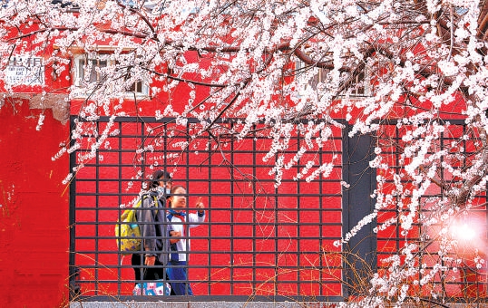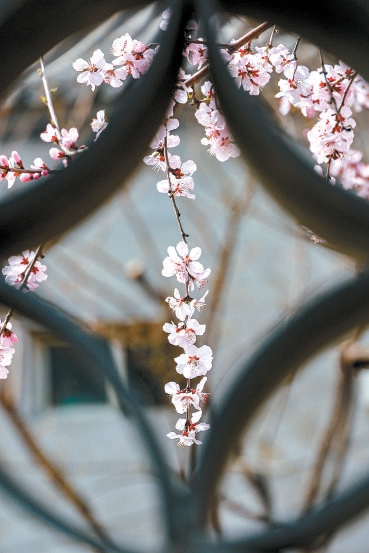 三里河公园内,山桃花盛开,透过墙上的花窗,一枝桃花难掩俏美身姿。苏国治 摄