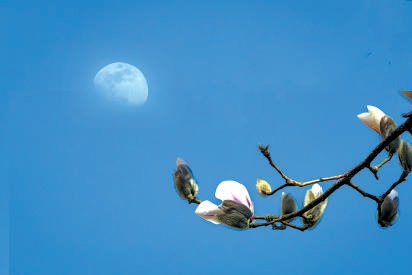 通州区车站路,明月已升,玉兰初放,两相映衬,美丽春色映入眼帘。 赵树生 摄
