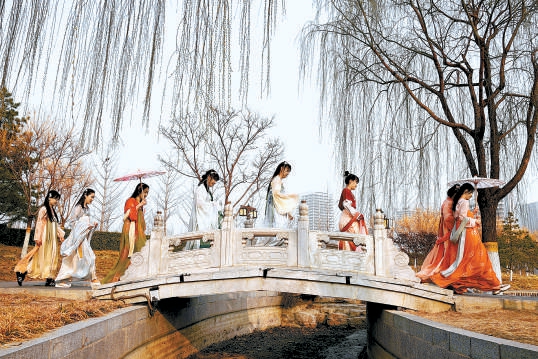 春风拂面,杨柳依依,通州西海子公园,几位穿汉服的姑娘结伴游园,如同穿越到古代。杨军 摄