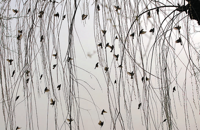 北海公园,柳树刚刚发芽,成群的麻雀飞舞在柳枝上,重现诗中“群莺乱飞”景象,化身音符,奏响春的乐章。欧阳明 摄