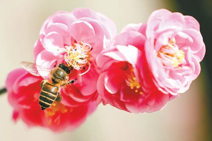 明城墙遗址公园,梅花盛放,蜜蜂采蜜辛勤劳作。孔明明 摄