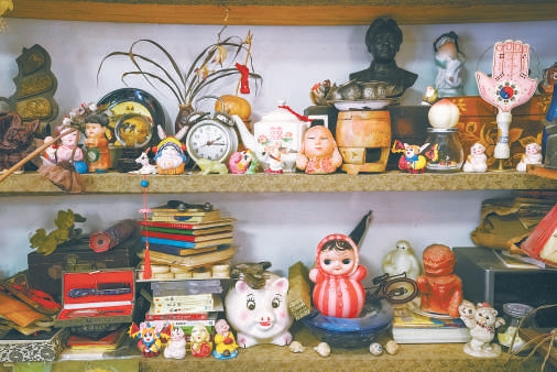 在书店一侧的货架上,摆满了富有年代感的物件。