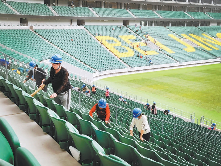昨天下午,记者走进工体内场,看到数十名保洁人员正在擦拭座椅;楼层间里,施工人员正在检测场内设施的安全性。俱乐部工作人员说,新工体的硬件施工和相关功能设施都已“齐活”,就差一些“小零碎”,预计周六开赛前都能如期完成。