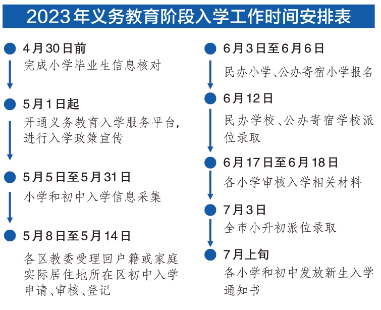 4月30日前,本市将完成小学毕业生信息核对;5月1日起,义务教育入学服务平台开通,进行入学政策宣传;5月5日至5月31日,进行小学和初中入学信息采集。
