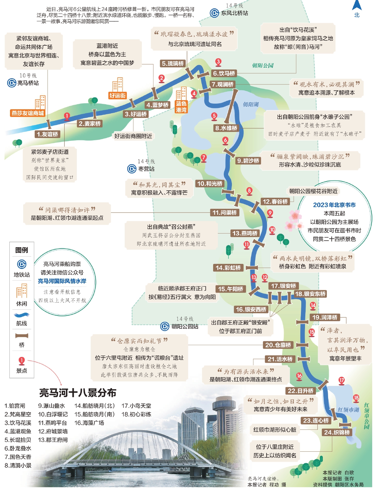 近日,亮马河6公里航线上24座跨河桥修葺一新。市民朋友可在亮马河泛舟,尽览二十四桥十八景;附近滨水绿道环绕,也能散步、慢跑。一桥一名称、一景一故事,亮马河乐游图邀您同赏——