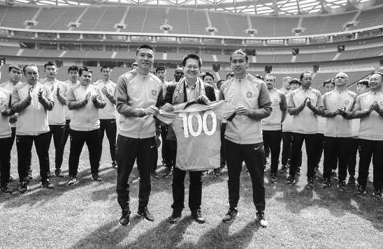 国安将士将印有100号的球衣,送给建设者代表丁大勇,表达对建设者付出的百分百谢意。