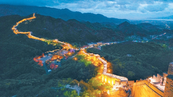 五一假期,市民游览夜长城。八达岭夜长城以“梦回长城,八方来鹤”为主题再度开放,经多方位全新升级改造,让游客感受沉浸式的游览体验。本报记者 潘之望 摄