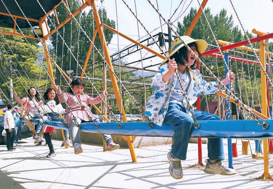 众多市民假期选择自驾京郊游,孩子们在怀柔渤海镇体验大秋千,参观历史农业文化展,快乐度假。本报记者 刘平 摄