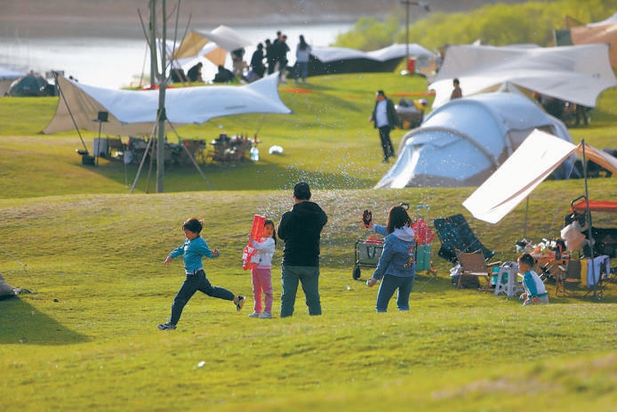 假期天气回暖,正适合露营休闲,平谷区的很多营地迎来大批市民,在此享受绿水青山间的惬意。本报记者 甘南 摄
