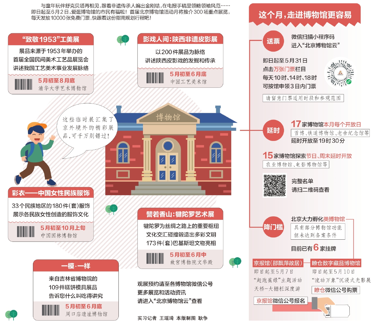 与童年玩伴舒克贝塔再相见,跟着非遗传承人编出金刚结,在电报手稿里领略领袖风范……即日起至6月2日,爱逛博物馆的市民有福啦!首届北京博物馆活动月将推介300场重点展览,每天发放10000张免费门票,快跟着这份指南规划行程吧!