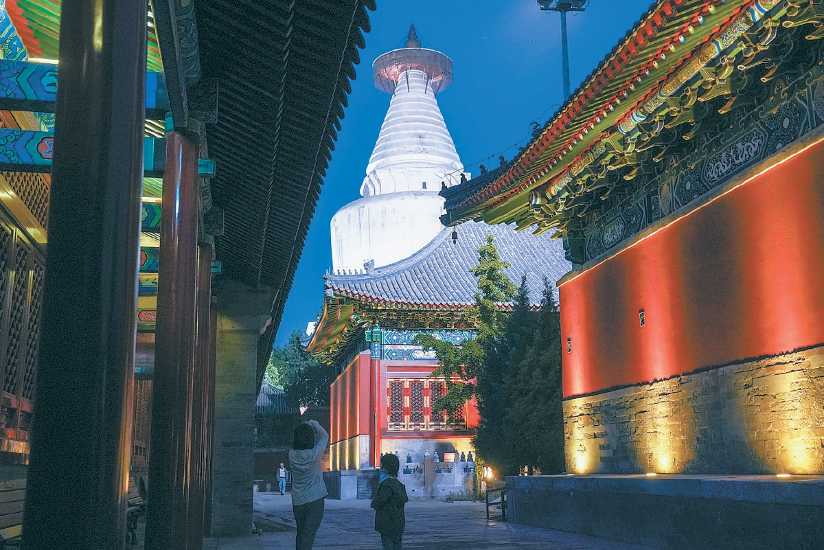 昨天,白塔寺延时开放,市民有机会在馆内欣赏夜色中被灯光装饰的美轮美奂的白塔寺建筑群。本报记者 武亦彬 摄