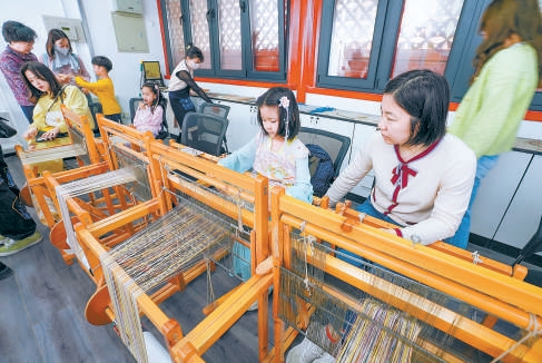 昨天,延时开放的北京艺术博物馆(万寿寺)内举行体验活动,小朋友在老师的指导下感受传统纺织技艺。本报记者 武亦彬 摄