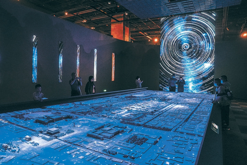在首都博物馆,参观者夜览“辉煌中轴”展,绚丽的光影效果吸引不少参观者在中轴线沙盘前驻足观赏。 本报记者 武亦彬 摄