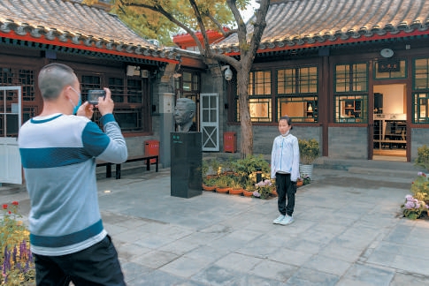 昨晚,夜幕降临,老舍纪念馆灯光亮起,一位游客正在为女儿拍照留念。实习生 马绪怡 摄