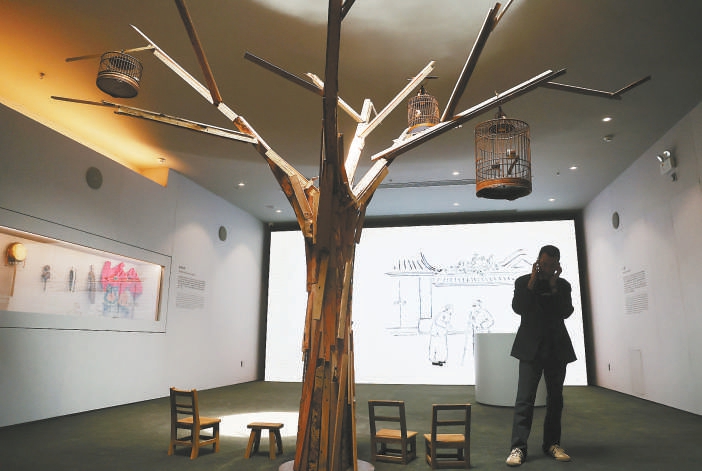 在展览现场,观众可以通过音视频作品感受北京清末民初的民间生活。其中音频的主要素材用的是秦思源多年以来收集的老北京声音,视频画面风格参考的是秦思源外婆凌叔华为她自传《古韵》画的插图。其全景声效果是根据每个场景内容而设计的,令人感觉如临其境。展厅中央还有一棵用槐树、柿子树、枣树、榆树、海棠树等北京常见树木木材塑造的“大树”,营造出胡同四合院里的亲切氛围。