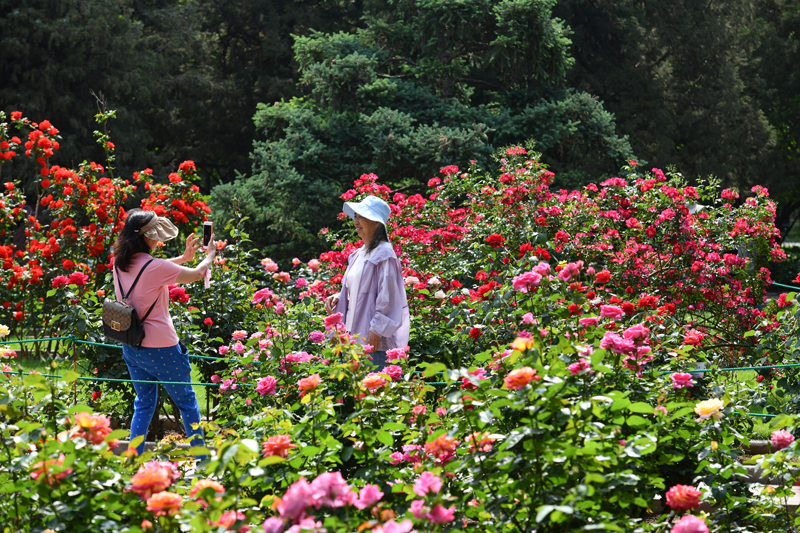 天坛公园月季园有着悠久的月季栽培历史。60岁的月季园现有300余个品种7500余株月季。其中,既有“天坛荣光”“凯歌嘹亮”“喜上眉梢”“霞辉”等十余个天坛自育品种,也有一些新引进的新优品种。“天坛荣光”花径达13厘米左右,粉色花瓣上呈现不规则的放射状条纹;与大多只有1个花蕊的月季品种明显不同,“凯歌嘹亮”盛开有3至4个花蕊,也十分漂亮。