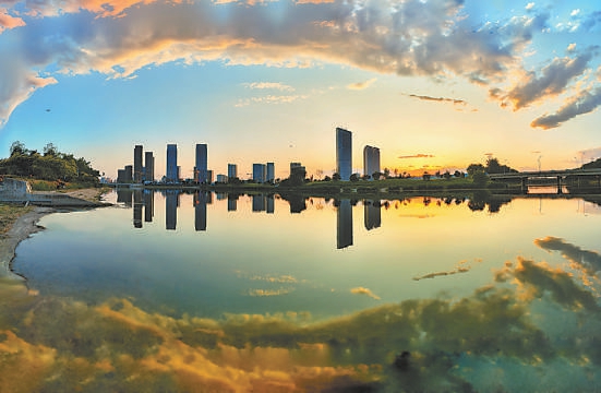 北京城市副中心五河交汇处,水天相连;炫彩晚霞,倒映水中,形如“眼眸”。“眼”中的运河商务区,千年大计,生机勃发。刘毅 摄