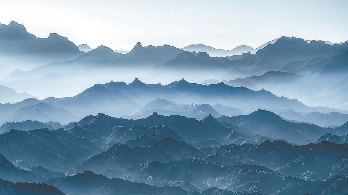 京北大地,层峦叠嶂,极目远眺,千年古长城在山巅蜿蜒盘卧。画面中由近及远,分别是北京的蟠龙山长城,河北承德市的金山岭长城,以及北京的司马台长城,三龙交汇,气势磅礴。吴强 摄