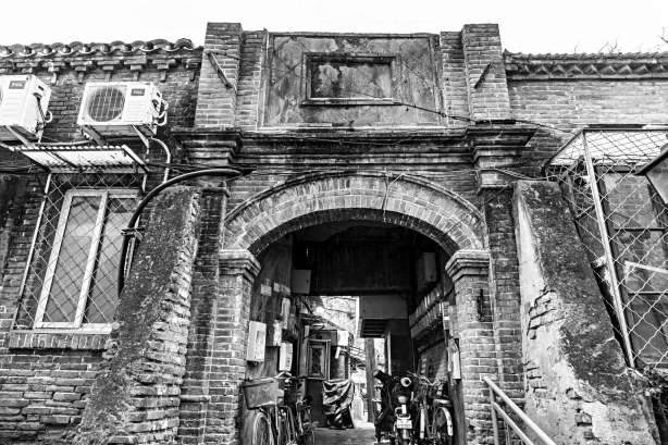 进得院内,可见古树参天,空间甚大。院内部分建筑为二层,很多细节仍保持着老构件。右侧尚有很具年代感的拱形连廊,可以想见当年气势之辉煌。只可惜,从门楼里堆放的自行车、三轮车及密密麻麻的电表就能看出,这里现为十几户人家的大杂院。由于临时搭建物较多,整个院落显得有些杂乱。
