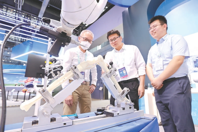 参观者在中关村论坛展览(科博会)观看单髁手术机器人。本报特约摄影 陈晓根摄