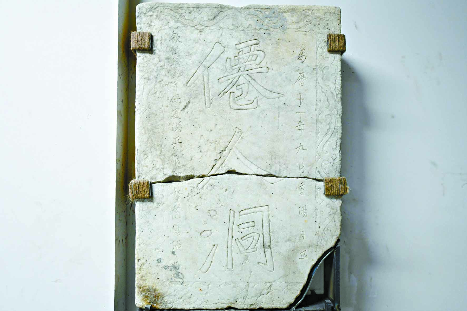 展厅中的石刻文物虽历经岁月洗礼,但大都保持独立的形状,“仙人洞”石匾额是其中的一个例外:以“人”字下沿的一道长缝为分界,匾额的上下两部分曾分离多年。