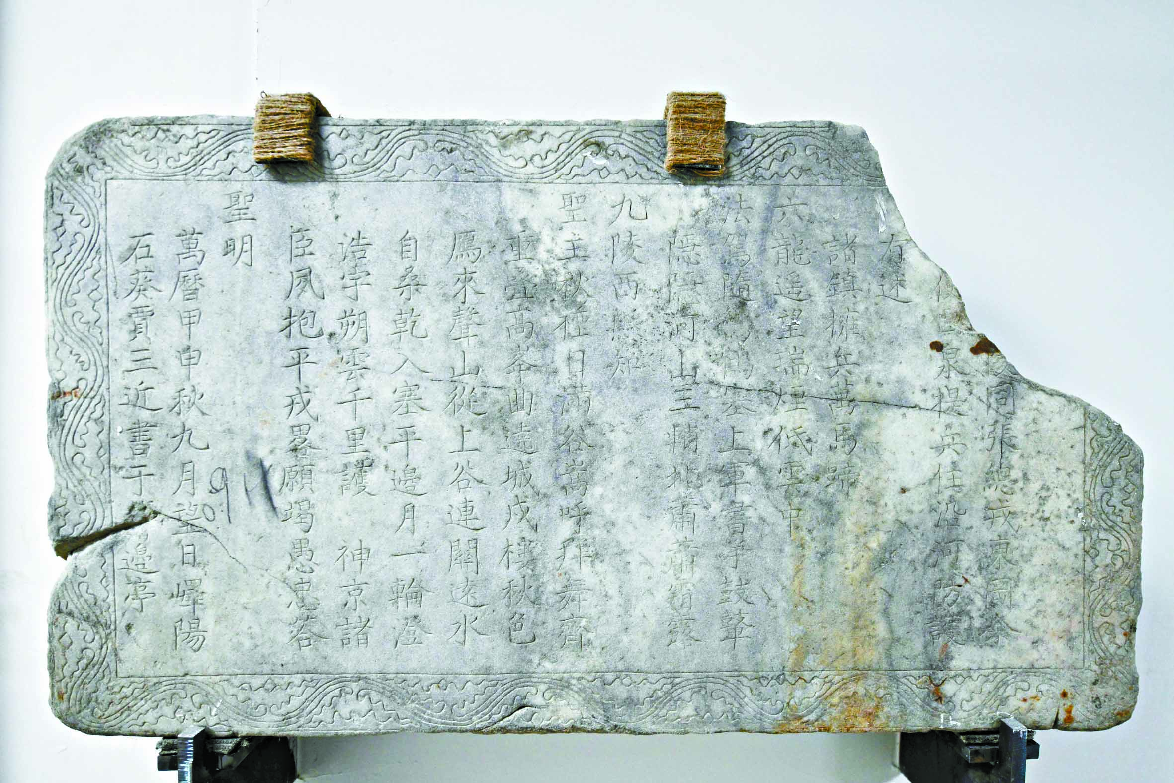 “诸镇拥兵万马蹄,六龙遥望瑞烟低;云中法驾随鸾鹤,塞上军书净鼓鼙……诸臣夙报平戎略,愿竭愚忠答圣明。”展厅中有一块缺失一角的石刻,是明万历甲申年秋贾三近视察沿河城防护诗刻石。石面上不过百余字,沿河城边关的壮美景色一览无余,字里行间流露出贾三近对边关将士忠君报国的祝福和感激之情。