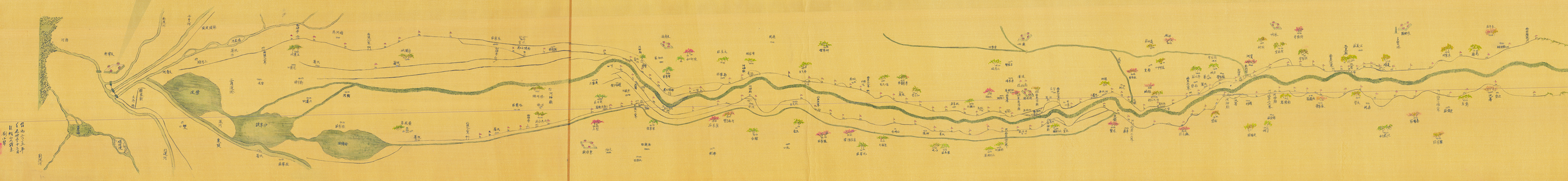 长卷作者为刘小琴,为永定河文化博物馆的副馆长,作品在参考《永定河志》(乾隆)、《清代河流舆图》等文献资料的基础上创作而成。观图可知,永定河发源于山西省管涔山天池,全程流经了华北地区的两市、两省、一区,共57个县市,途经山地、高原、平原、丘陵、盆地五大地形。清乾隆时期,永定河于天津入海,全程约747公里。