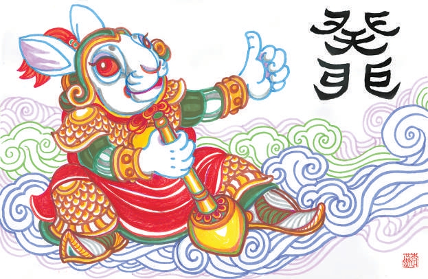 “兔年”已至,我创作了一幅顶盔掼甲、手执金杵的兔神,它正驾五彩祥云自月宫而下。借其济世除疫的吉祥寓意,祝福人人平安顺遂。