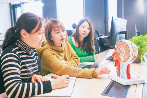 在首钢基金产融创新基地,北京达尔文细胞生物科技有限公司员工讨论产品。