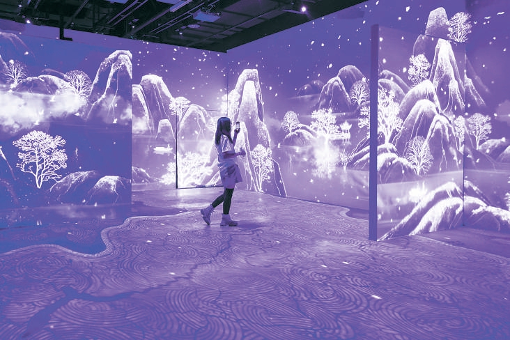 在首钢园瞭仓艺术馆,沉浸式数字艺术展带游客感受科幻魅力。
