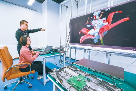 在首钢园中关村科幻产业创新中心,元旭半导体科技股份有限公司工作人员调试LED屏产品。