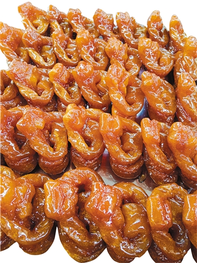 “耳朵竟堪作食耶?常偕伴侣蜜麻花。”蜜麻花是老北京小吃中的代表,又称糖耳朵,因其形状似人的耳朵得名。与其相似的小吃还有蜜三刀,原料几乎一致,只是形状不同。