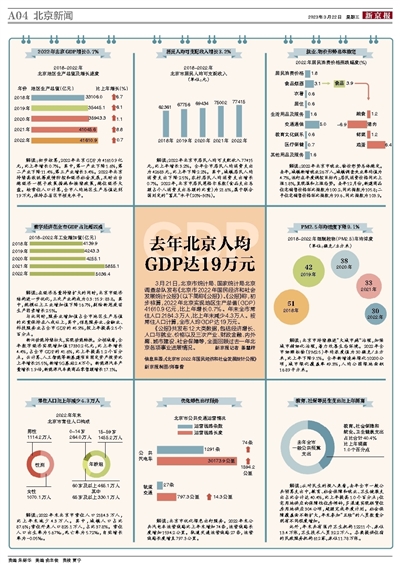 3月21日,北京市统计局、国家统计局北京调查总队发布《北京市2022年国民经济和社会发展统计公报》(以下简称《公报》)。《公报》称,初步核算,2022年北京实现地区生产总值(GDP)41610.9亿元,比上年增长0.7%。年末全市常住人口2184.3万人,比上年末减少4.3万人。按常住人口计算,全市人均GDP达19万元。