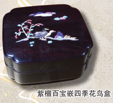 一对紫檀百宝嵌四季花鸟盒也来自副中心。整器为梅型,制作精巧,边线柔和。盒盖精细开槽,精选材料经雕、刻、琢、磨,运用嵌、饰、描、堆等技法组成精致画面。其中一个盒底刻“禧”字,盒子上画有红蓼双雁图,鸿雁、芦苇、白云、青山等。另一个盒底刻“寿”字,盒盖画了白鹭、芙蓉、白云、荷花等。由于百宝图案会随着光线角度的变化而五彩斑斓,所用辅胶沿袭古法,力求经久传世。