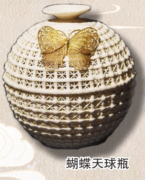 随着时代的发展,传统技艺与现代技术“混搭”,赋予了艺术品更多“时尚感”。杨学晨用“行家视角”讲起现场东方艺珍另一件花丝镶嵌作品“景泰蓝香炉”的门道,“这个香炉融合了两项非遗技艺。下面的木托制有花丝,底座用于稳固香炉整体三足摆放之用,炉身以多色景泰蓝烧制而成的缠枝莲纹象征着福禄康宁,上面的花丝炉盖有很好的透气性,可以让焚香烟气完美透出,兼具创新性和实用性。”而“蝴蝶天球瓶”整体材质由陶瓷制成,通体镂空,技艺高超精细。上面趴着一只展翅欲飞的蝴蝶,彷佛是花瓶上有一只蝴蝶栖息,有光线穿过时有玲珑剔透的美感,创新性地将花丝镶嵌技艺与陶瓷工艺结合,极富艺术美感。