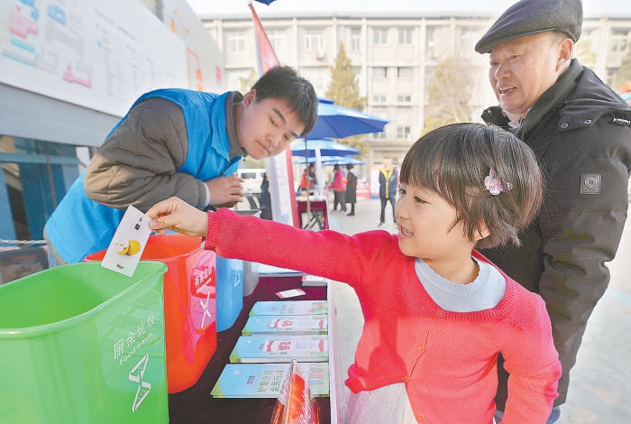 昨天,志愿者在社区普及垃圾分类知识。本报记者 王海欣摄