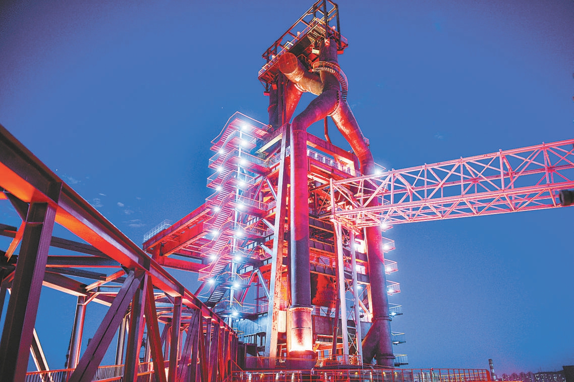 经过改造的首钢三高炉成为京西一处别具特色的活动场所,夜晚亮起红色灯光后更添科幻色彩。本报记者 邓伟摄