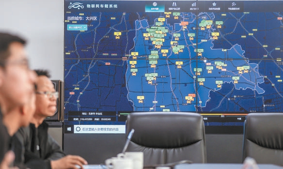 大兴区生态环境局内,通过车载颗粒物监测系统,工作人员在实时查看公交车及出租车监测到的PM2.5数值。本报记者 武亦彬摄