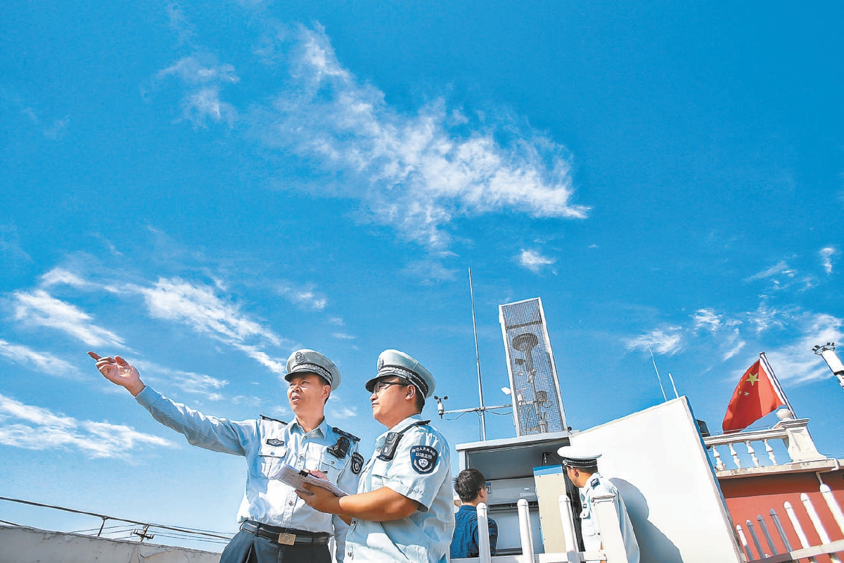 靓丽蓝天不断增多的背后,有着无数一线环保工作者的默默付出。在一处PM2.5监测站点,北京市环境监察总队执法人员在讨论监测数据。本报记者 武亦彬摄