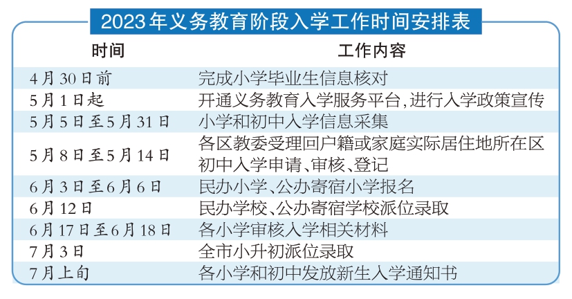 4月30日前,本市将完成小学毕业生信息核对;5月1日起,义务教育入学服务平台开通,进行入学政策宣传;5月5日至5月31日,进行小学和初中入学信息采集。
