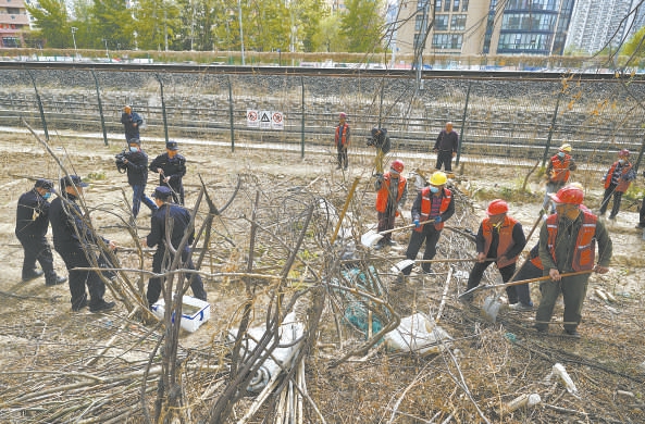 昨天,来广营乡综合行政执法队20名队员,对13号线北苑地铁站和立水桥地铁站中间地带北侧一个高压铁塔下的菜园进行了清理,并拆除了周边违章建筑。供电部门表示,在高压线塔基座附近开垦种菜,一定程度上破坏了电力设施,雨天在此进出更是存在安全隐患。来广营乡综合行政执法队表示,将联合电力部门继续加大监管力度。 本报记者 程功摄