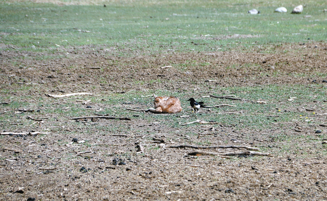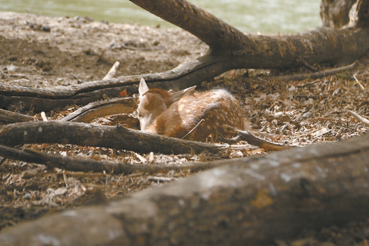 4月11日10时,工作人员巡护时发现,在远离鹿群的草地上有一只带有斑点的小麋鹿。“小家伙应该是刚刚出生,我们发现时,它正安静地卧在那儿睡觉,旁边还有只喜鹊。”工作人员说,这是今年麋鹿生态实验中心发现的第一只新生小麋鹿。