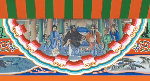 颐和园长廊彩画的亮点,是多达300余幅的包袱人物画。这些人物形象有的源于《西游记》《三国演义》《水浒传》等古典名著,有的源于《瑶台献寿》《嫘祖饲蚕》《贵妃出浴》等民间传说,有的源于《羲之饲鹅》《太白醉酒》《米芾拜石》等名人轶事,有的源于《高山流水》《画龙点睛》《举案齐眉》等成语故事,有的源于《玉堂春》《打渔杀家》《铡美案》等戏剧片段,内容极其丰富。
