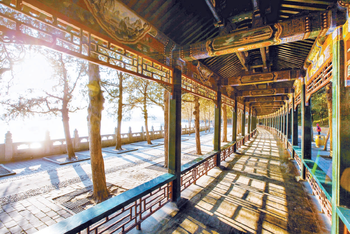 颐和园万寿山与昆明湖之间,是著名的颐和园长廊,这是我国古建园林中最长的游廊。“颐和园长廊彩画保护研修项目”目前正在这里展开。