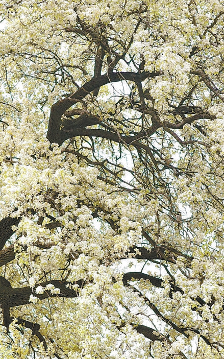 天坛公园靠近北宰牲亭红墙外的绿地中,一株高大的杜梨日前进入盛花期。白色繁花点缀于树间,展现出旺盛的生命力。 本报记者 刘平摄