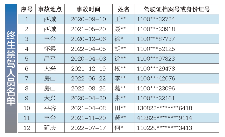 这次被吊销机动车驾驶证人员因发生交通事故后逃逸构成交通肇事罪,已分别被法院依法判决,交管部门依法吊销其机动车驾驶证。这12人中,最大年龄74岁,最小年龄26岁,他们都将终生不得重新取得机动车驾驶证。