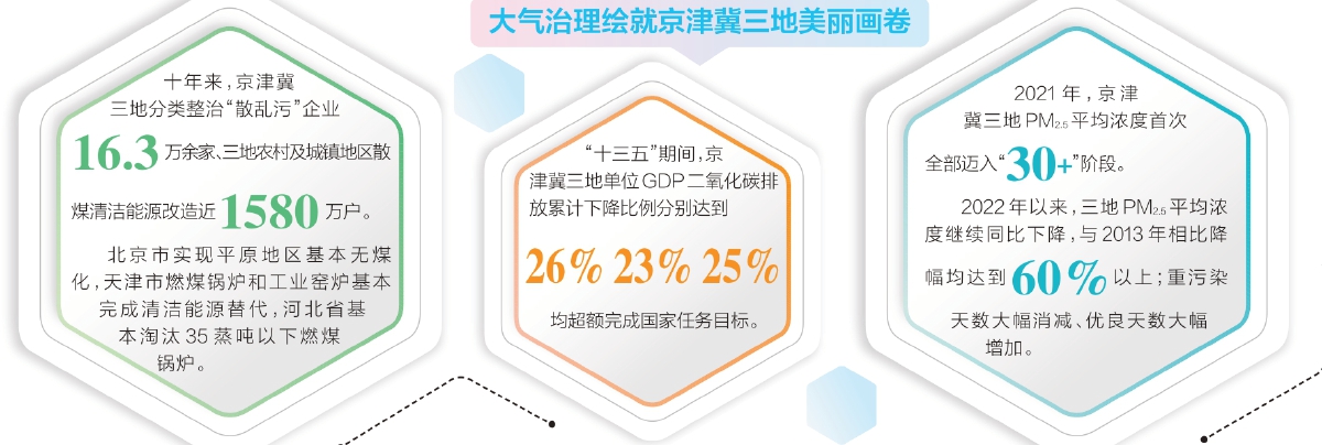 镜头见证着蓝天的回归。2014年,官方公布了京津冀、长三角、珠三角74个城市的空气质量状况,中国空气最差十城中,京津冀区域内8个城市赫然在列。2023年1月,同样一份名单再次公布,京津冀区域不仅无一城市上榜,河北张家口还入列全国空气质量最佳前十名单,北京入列最佳前二十。