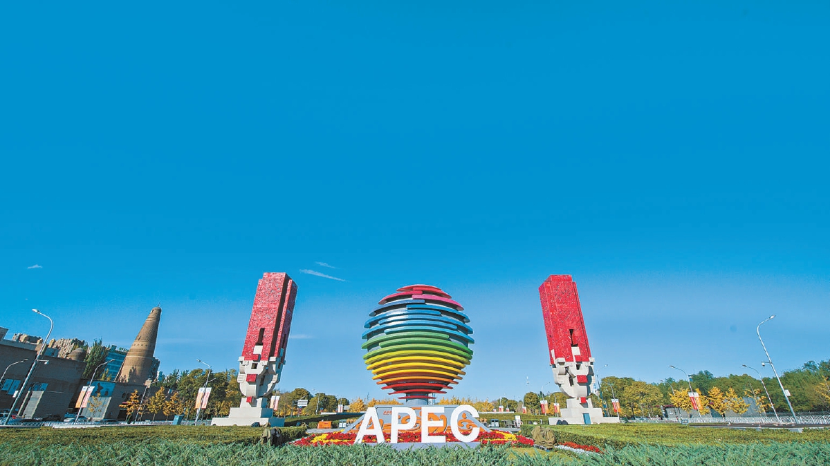 2014年APEC会议期间,天高云淡,秋色怡人,位于北京中轴线上的APEC花坛在蓝天下更显靓丽,以最美丽的姿态欢迎四方宾朋。本报记者 邓伟摄