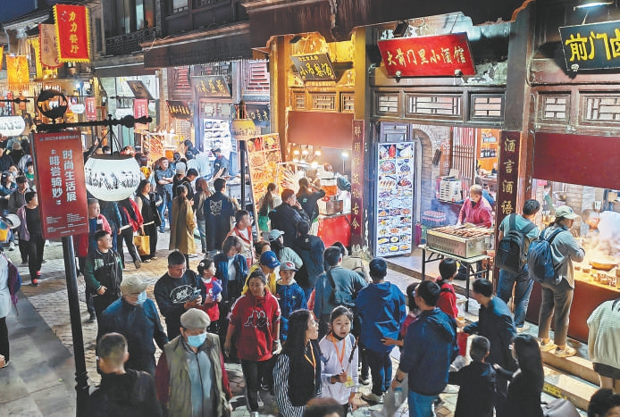 随着天气渐暖,京城夜经济也开始火爆起来,“五一”来京旅游的游客白天看景、晚上逛街品美食,在前门鲜鱼口美食街,晚上就数饭馆生意红火。本报特约摄影 庞铮铮