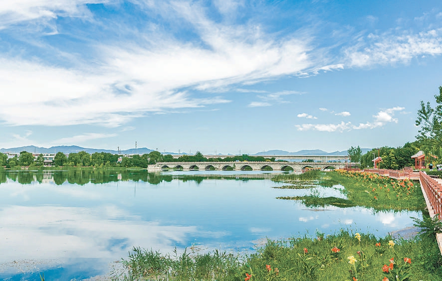 卢沟桥畔晓月湖倒映出蓝天白云,呈现出一幅“天空之镜”的美景。人们漫步永定河畔,仿佛徜徉在灵动的画卷之间。